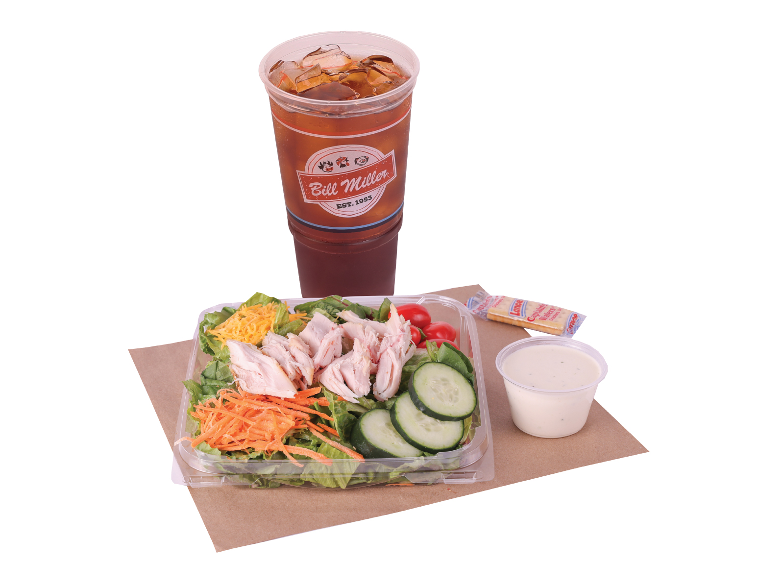The Salad De-Lite Combo comes with an iced tea and the choice of Turkey, Fried Chicken Tenders, Brisket, or BBQ Chicken. All options come with cheese, tomatoes, cucumbers, carrots, and ranch dressing.