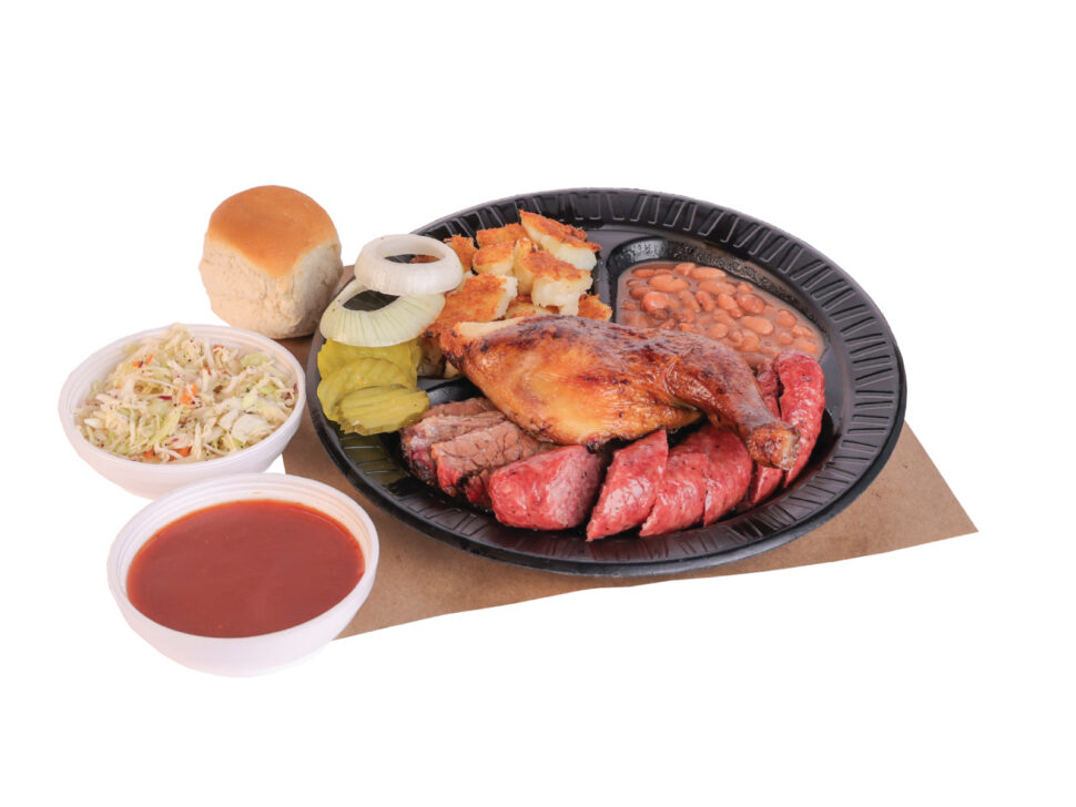 3 Meats, 3 Side Orders with your choice of Beef Brisket, BBQ Chicken, Turkey Breast, or Sausage. *Please choose from pinto beans, potato salad, coleslaw, Spanish rice, green beans, hash browns, or french fries.