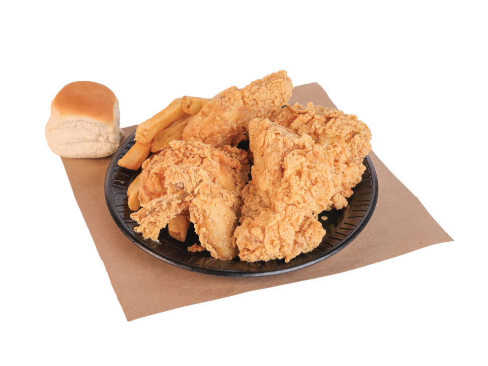 4 pc. Fried Chicken Our Choice, fries & dinner roll.